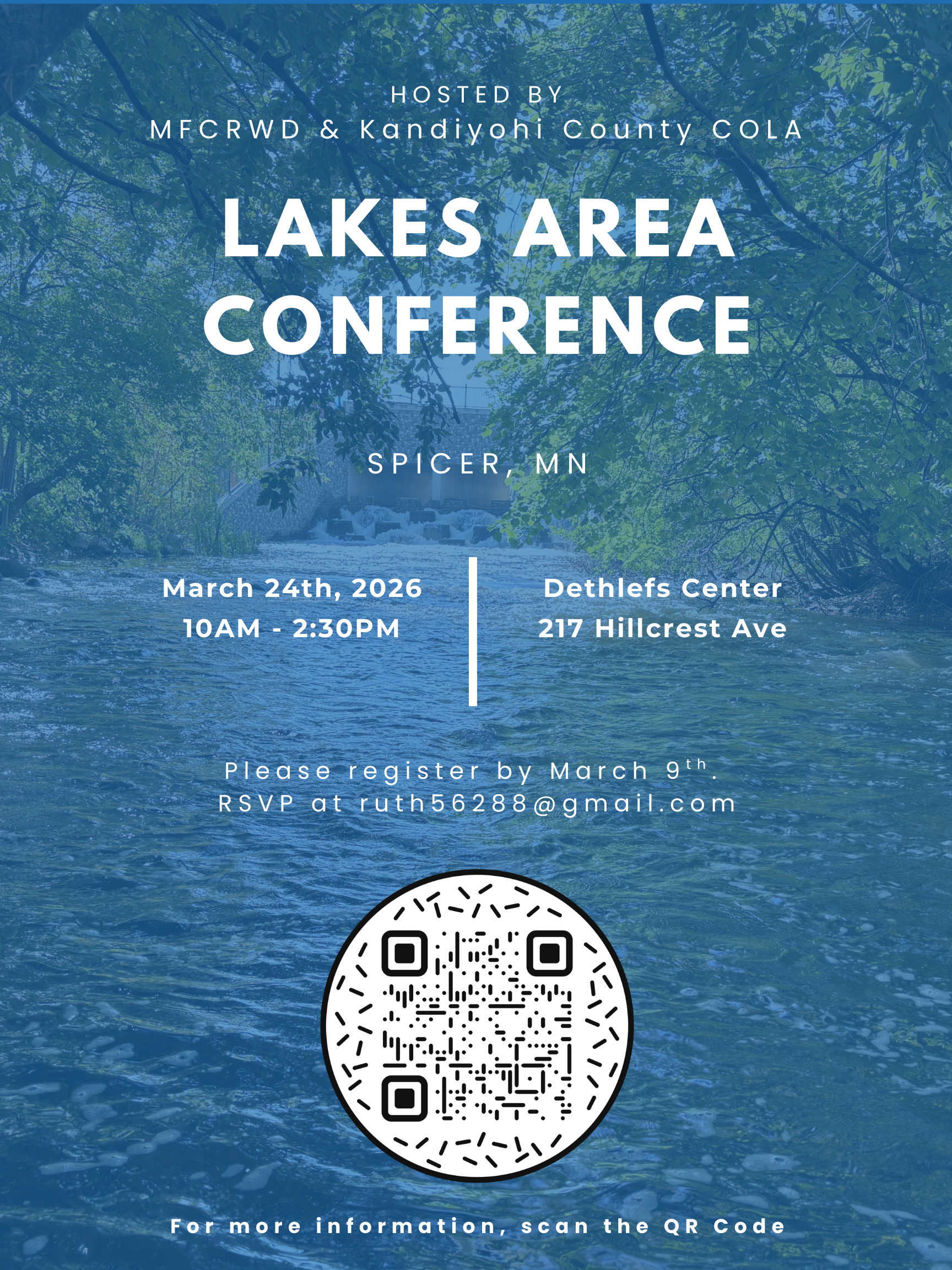 Passionate about protecting our lakes? Join us on March 24th for the Lakes Area Conference! In partnership with Kandiyohi County Coalition of Lake Associations (COLA), we’re hosting an engaging event for lake owners, lake associations, and anyone who cares about protecting our waters. Hear from local experts about safe wake zones and preventing shoreline damage, shoreline protection and the role of the Minnesota Department of Natural Resources, watershed district resources and projects, starry stonewort updates in our area, and other helpful tools for lake communities.